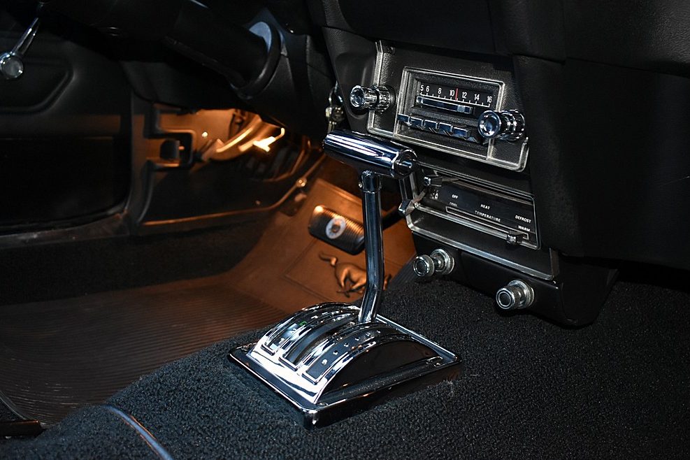 The interior is Ford’s Black Kiwi Vinyl on the standard Mustang bucket seats. A few points off for a replacement radio that mimics the FoMoCo AM-only radio but has a slide down bar with an FM tuner built-in.