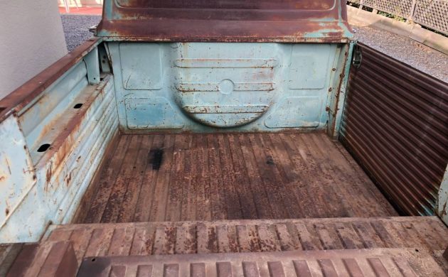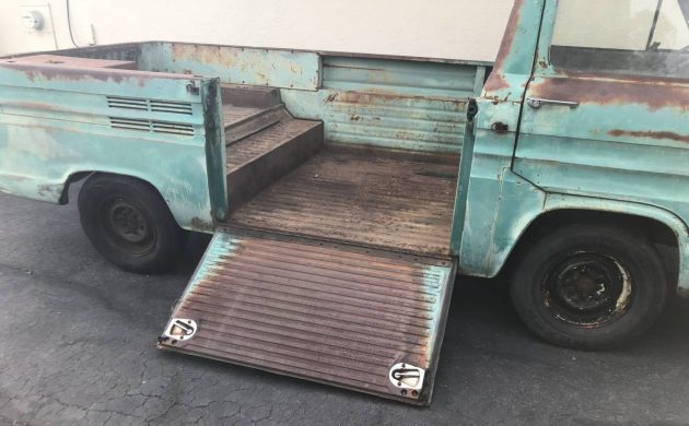 Rampsides used the same 145 cubic inch flat-six as the passenger Corvairs. An appliance company once employed this one, and we can see how the side ramp would be helpful in delivering refrigerators. The engine and transmission have taken flight, and the seller was thinking of dropping in a V6, but never got around to it. The odometer reflects 65,000 miles, but we’re told it’s on its second time around.