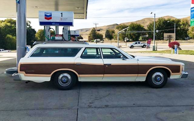 From Sid C – I recently stopped in Horseshoe Bend, Idaho for gas and up rolled this beauty. I said, “WOW, look at that”! My wife responded with, “Yuck”! I visited with Jeff, the owner and he told me a bit of the history. This 1974 Ford Country Squire LTD was purchased new by his mother-in-law. After being retiring as a daily driver, Jeff and his wife had it repainted and NOS side “wood” replaced.