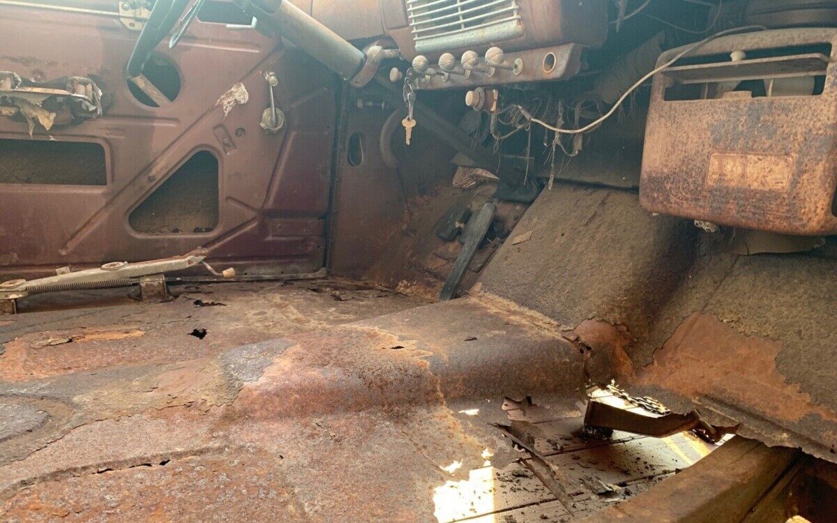 The interior is essentially gutted. There is a fogged instrument panel and a cracked steering wheel but not much else. The what-was-painted-at-one-time steel dash is all surface rust and the deleterious condition of the floor pans is obvious. Things such as the seat frames and door panels are nowhere in sight.