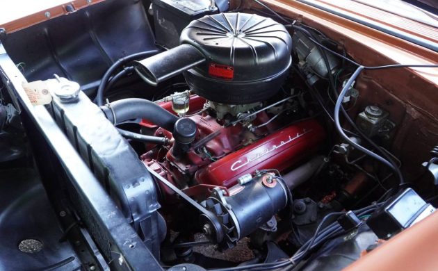The seller indicates that most of this Bel Air’s refurbishment has been faithful, with the interior receiving a retrim in the correct combination of Copper and Gray. The painted surfaces and the wheel sport the same Sierra Gold found on the exterior, with the dash’s bright trim looking exceptional. You must look pretty hard to find anything inside this Bel Air to fault, although a close inspection reveals some wear to the seat piping on the driver’s side. It isn’t bad enough to prompt another retrim, and a competent upholsterer might be able to stop further deterioration in its tracks. Otherwise, this interior is sure to grab plenty of positive comments. I can’t spot any aftermarket additions, with the car featuring a factory clock and a pushbutton radio.