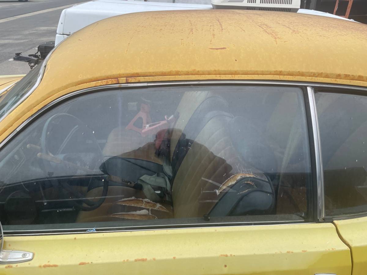 The doors are stuck shut, so the interior photo was taken through the window glass. Speaking of window glass, that’s special on a Duster. At the time, side glass was typically 90-inch radius sheets. But to bring the roofline lower and follow the curve of the sheet metal, the Duster’s designers wanted to try 45-inch radius glass. It fit, but barely. The rear windows can’t roll down – they pivot. From what we can see, that interior will need work – the seats are torn and who knows what doesn’t work in there.