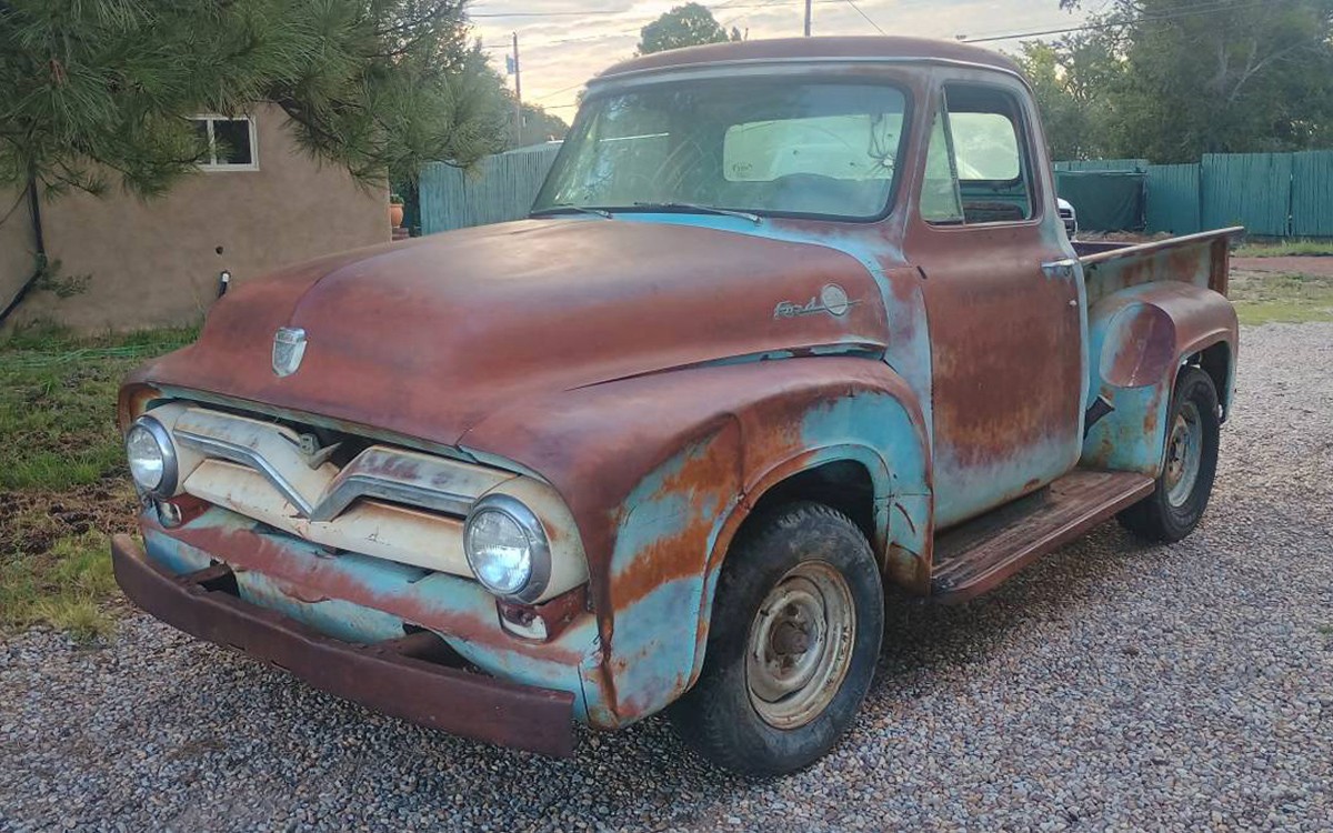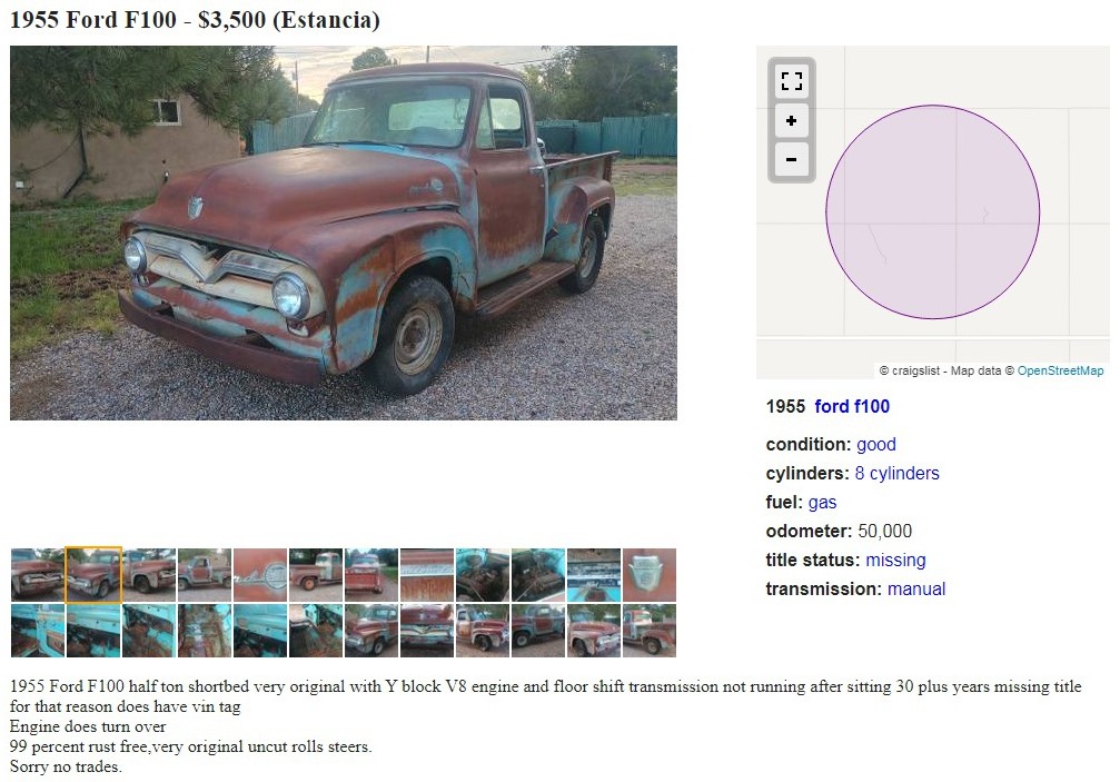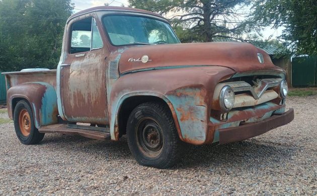This 1955 Ford F-100 is said to have been sitting for over three decades and is 99% rust-free, and it looks it. If you don’t count surface rust, that is. The flattened left front fender is an interesting look, I wonder how that happened? The seller has it posted here on craigslist in Estancia, New Mexico, just southeast of Albuquerque, and they’re asking $3,500. $3,500 for a basically rust-free ’55 Ford pickup with a V8?!. Here is the original listing, and thanks to T.J. for the tip!