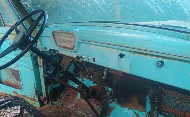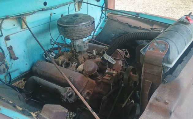 Is that left front fender (in the opening photo) an attempt to modernize this otherwise rounded pickup? Just kidding, of course. I have to say, I don’t hate the way that looks, at least if it were like that from the factory. The right-front fender seen above is another squished, formerly bulbous fender. I wonder what happened there, maybe just decades of driving tractors or other vehicles past this one as it was in storage? We’ll never know, and just about every body panel is available in the aftermarket for this truck, so if you aren’t a panel-beater, you can get new fenders, and maybe running boards, etc.