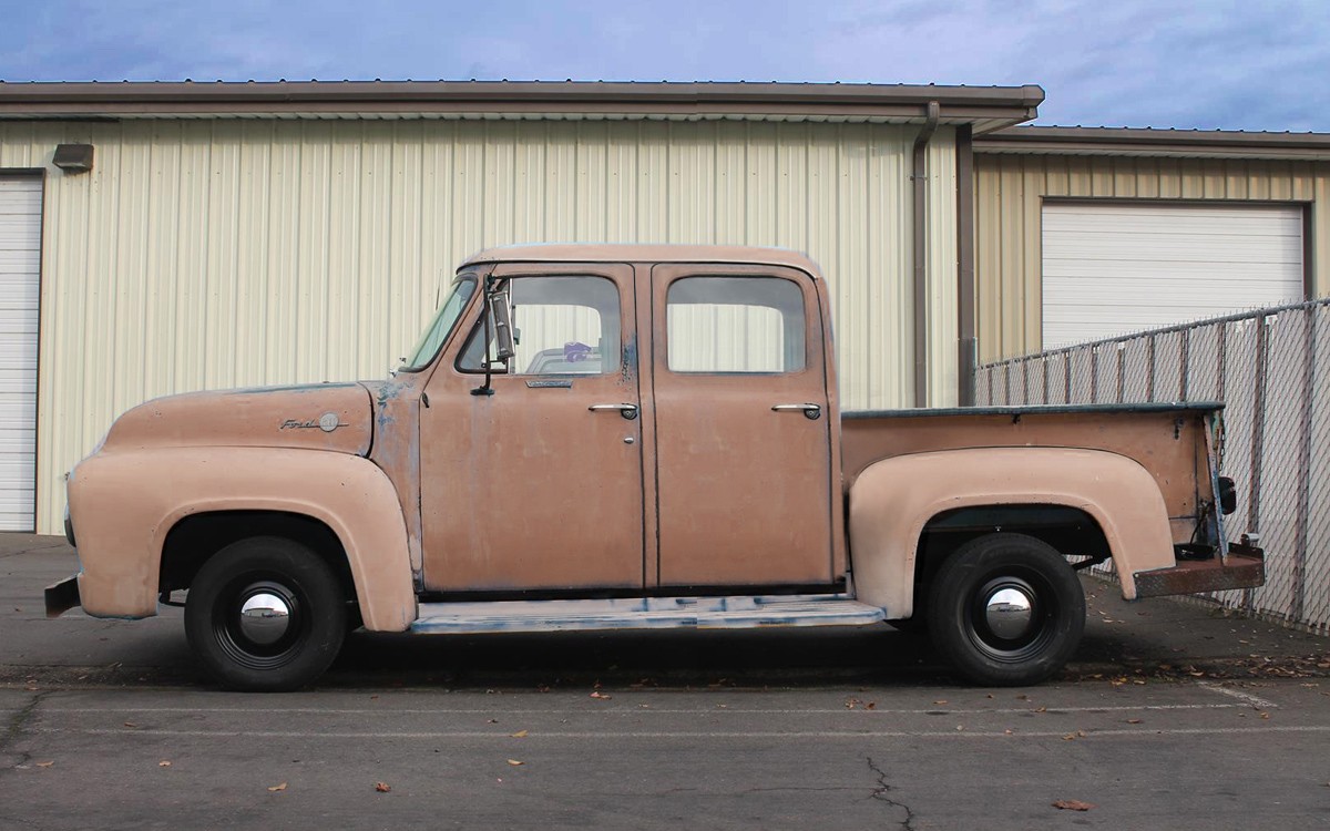 Interesting Scotty that you would mention that left front fender. That was my first thought, it almost looks factory such that it matches the spare tire carve-out for the rear fender. And a ’55 Ford Crew Cab chop, interesting.