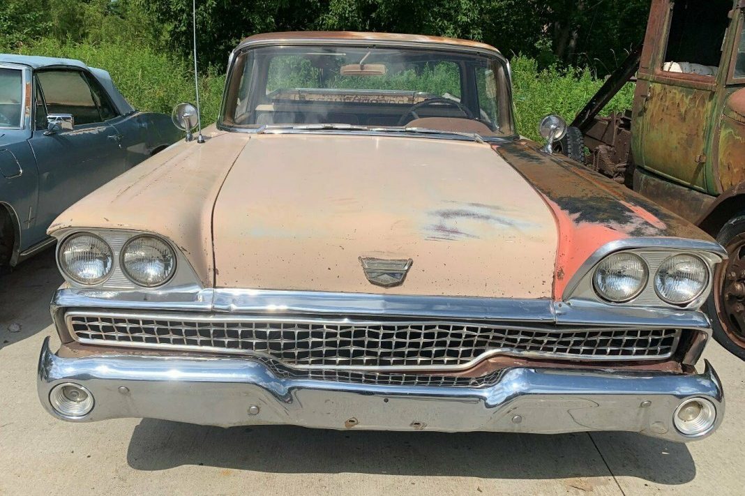 The author is mistaken about the grille being “wrong”. Although bent, that is a correct ’59 Ford grille.