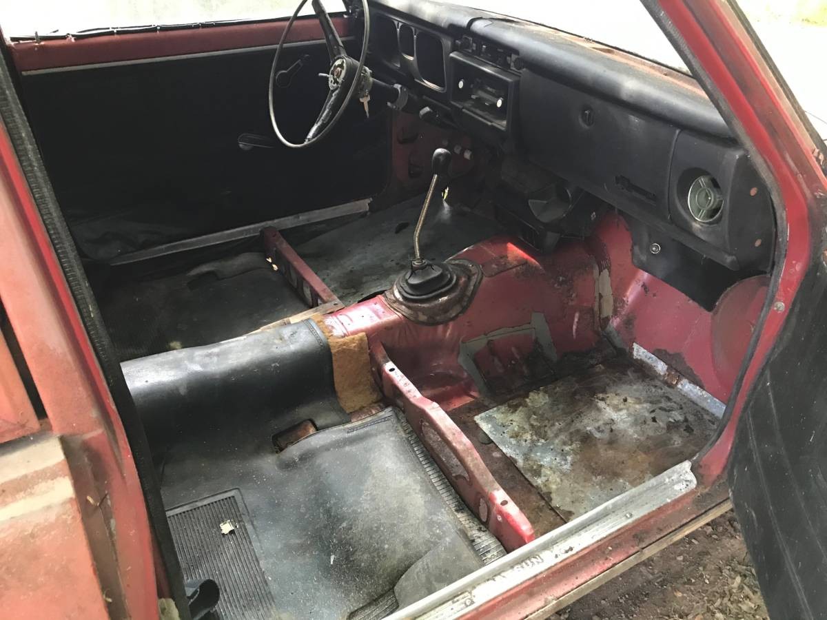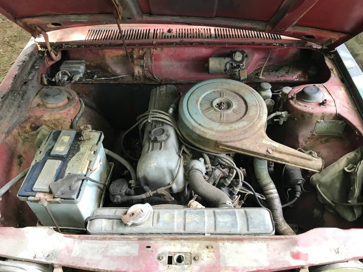Unfortunately, there are not any undercarriage pictures, but the seller does describe the exterior as “rough and rusty,” and I’m inclined to agree. The car has very faded red paint, except for the fender, which is blue and oddly not as faded as the rest of this Datsun’s paint. It is also missing a headlight and both of the front marker lights.