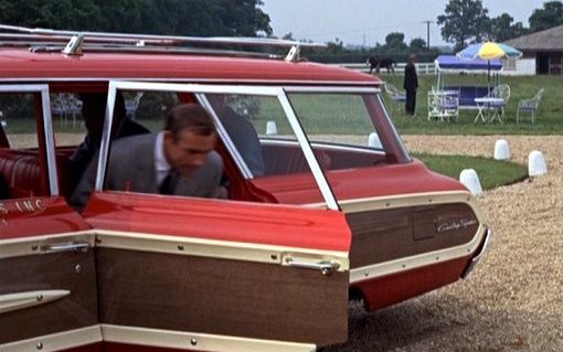 The first time that I spied this wagon, I thought of the above image from James Bond’s Goldfinger. I remember thinking, what a drag, you get to hotshot around in a machine-gun equipped Aston Martin DB5 and now you’re being held captive by a whacko Korean butler (with a stylish, if deadly, hat) and forced to ride in the backseat of a Ford station wagon – something’s not right. Anyway, the story with this Country Squire is that the seller’s father garaged it in ’75 with the intention of doing an engine overhaul on account of oil burning (it has 113K miles on its clock). Well, 47 years later, it’s still sitting there waiting on that nascent refurbishment.