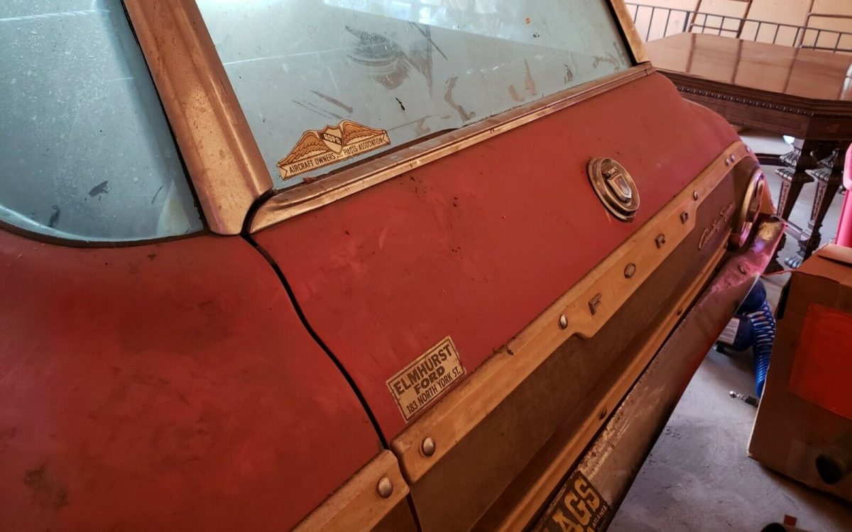 The seller claims minimal rust but that rotted out rear passenger-side quarter tells a different story and looks like a bit more than “minimal rust”. I’d run with the assumption that the rust was probably caused by salted Illinois winter roads and happened before the 1975 slumber commenced. And it stands to reason that the driver’s side may be so afflicted but there are no confirming images. Beyond that, there is some light surface rust but the body, under a very faded Rangoon Red finish, appears to be straight and complete. The exterior images aren’t that revealing but from what can be seen, the faux wood applique still presents well, probably courtesy of the garage storage.