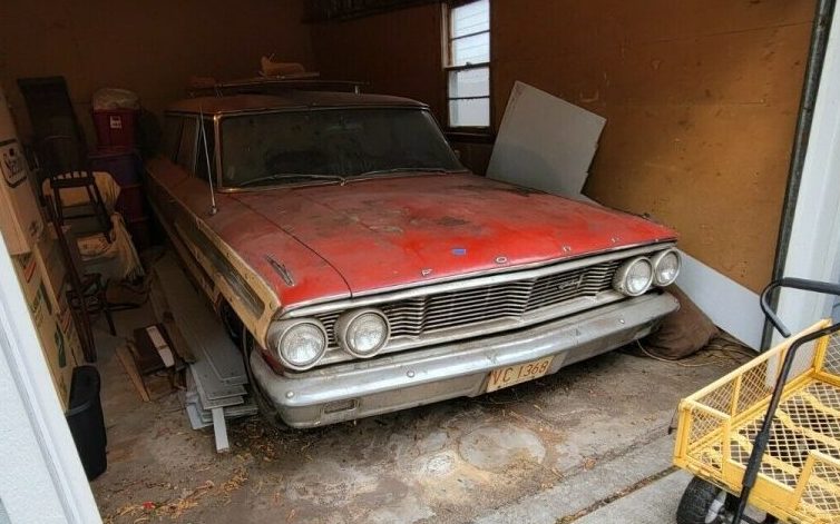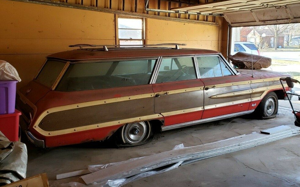 You have probably heard the saying that every picture tells a story. Well, every old car usually tells a story too and this 1964 Ford Country Squire is no exception – more on that to follow. Many of the Country Squires that we cover are the ’73 and newer humongo versions, so finding a non-smog choked earlier example – sans ramming speed bumpers, and in this setting, is a treat. Lombard, Illinois is where you’ll find this long-parked Ford wagon and it is available, here on eBay for a current bid of $4,200 with 38 bids tendered so far.