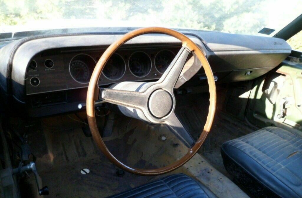 It’s hard to believe from this photo, but apart from the carpet and headliner, the interior looks like it is complete, unmodified, and in pretty good condition. Certainly, the dash pad looks good, the dash itself is unmodified, and it looks like the trim pieces that aren’t attached to the car are present in some of the photos. Once again, that green-on-green color scheme must have looked extremely nice. It’s also worth noting that the Challenger has only covered a claimed 15,200 miles, but I’m not really sure about the relevance of that claim once we lift the hood.