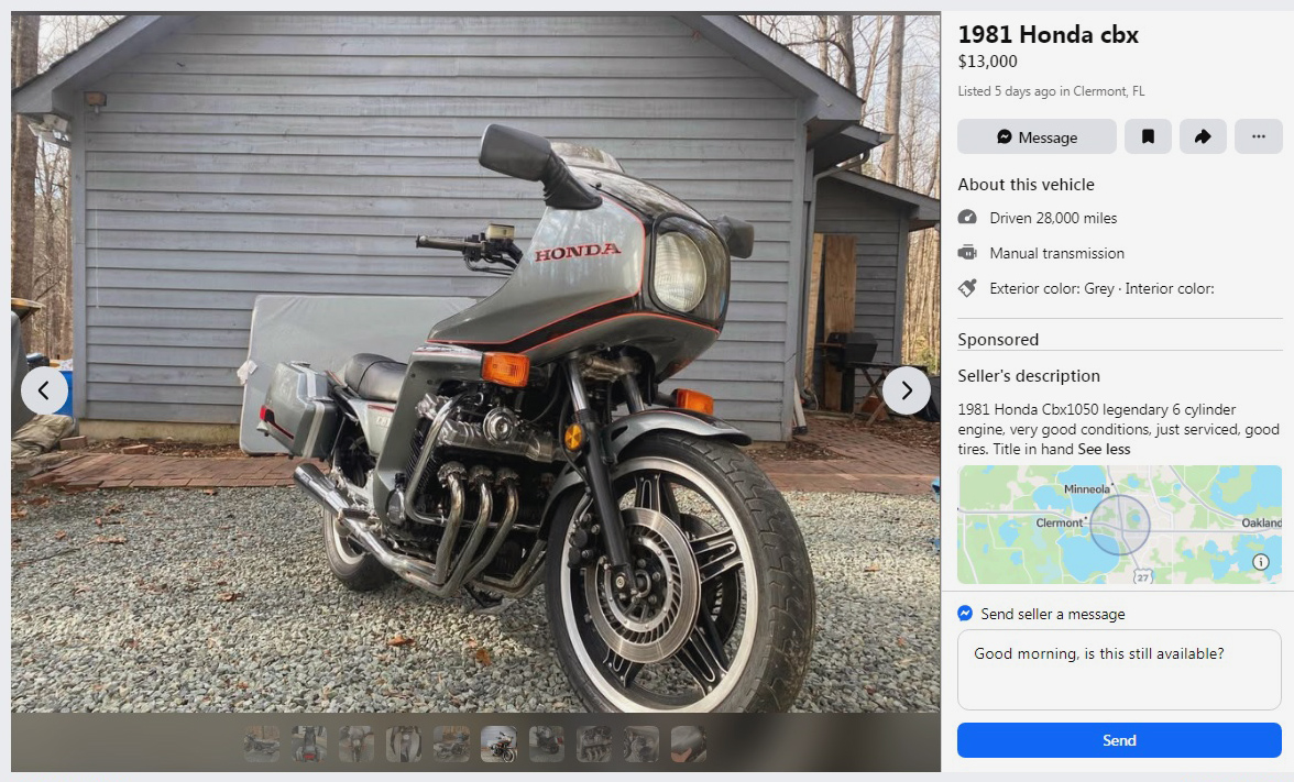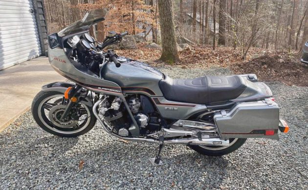 A superbike with a faring and bags?! Yes. Think of this motorcycle sort of as Clark Kent and Superman all rolled into one, without it having to find a phone booth to change clothes. Or to remove the travel gear, in this case. This 1981 Honda CBX is posted here on Facebook Marketplace in Clermont, Florida, and they’re asking $13,000. Here is the original listing, and thanks to Patrick S. for the tip!