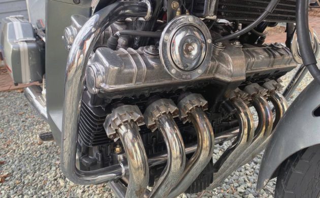 Otherwise, there really is no comparison between my 750 Yamaha and this CBX. They both have two mag wheels, an engine (mine is a triple, so half the cylinders), a seat, and a gas tank, but a Subaru 360 has four wheels and an engine, and so does a Gallardo. Enough of that. Honda made the six-cylinder CBX for a handful of years, from 1978 through 1982, and it wasn’t the first six-cylinder motorcycle, but some would argue that it was the best. The seller says this bike is in very good condition, was just serviced, and has good tires.