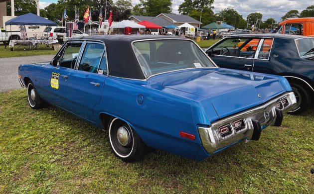 There’s my favorite view of this era of the Dart sedan, with the very cool concave rear window and big, flat trunk. This one gets extra points for being a pre-1974 car with the beautiful rear bumper. The front bumper was already regulation’ized, but the 1973 cars had a nice, small rear bumper. That wasn’t the case in 1974. It also gets extra points for the black steel rims and dog dish hub caps. Sadly, points are deducted for rust being hidden under both sides of the vinyl top at the C-pillar, and general vinyl top issues.