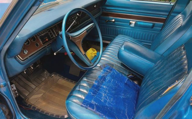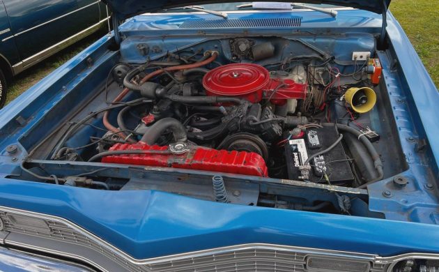 The unusually painted engine is Dodge’s 225-cu.in. slant-six with 105 horsepower and 185 lb-ft of torque, and this one doesn’t have the preferred three-on-the-tree, but a three-speed TorqueFlite automatic. It also has power steering, a very nice feature, and you can see the air-conditioning compressor there, and the seller says everything works except the parking brake. I love this one, but the rust under the vinyl top gives me the shivers. Any thoughts on this Dart?