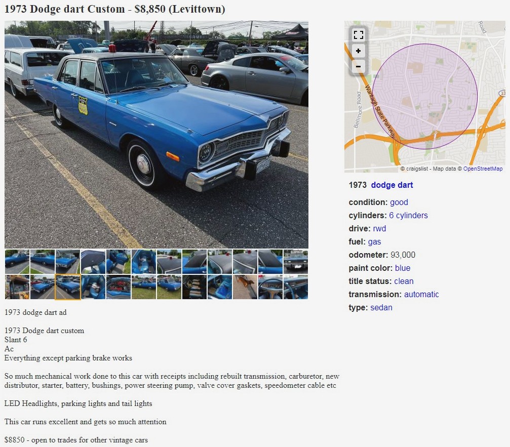 You don’t have to be cheap, I mean, frugal, to have purchased a Dodge Dart, but their advertising touted its value: “Dodge Dart… more than one million sold to the economy minded.” This 1973 Dodge Dart Custom Sedan is posted here on craigslist in Levittown, New York, and the seller is asking $8,850. Here is the original listing, and thanks to Zen for the tip!