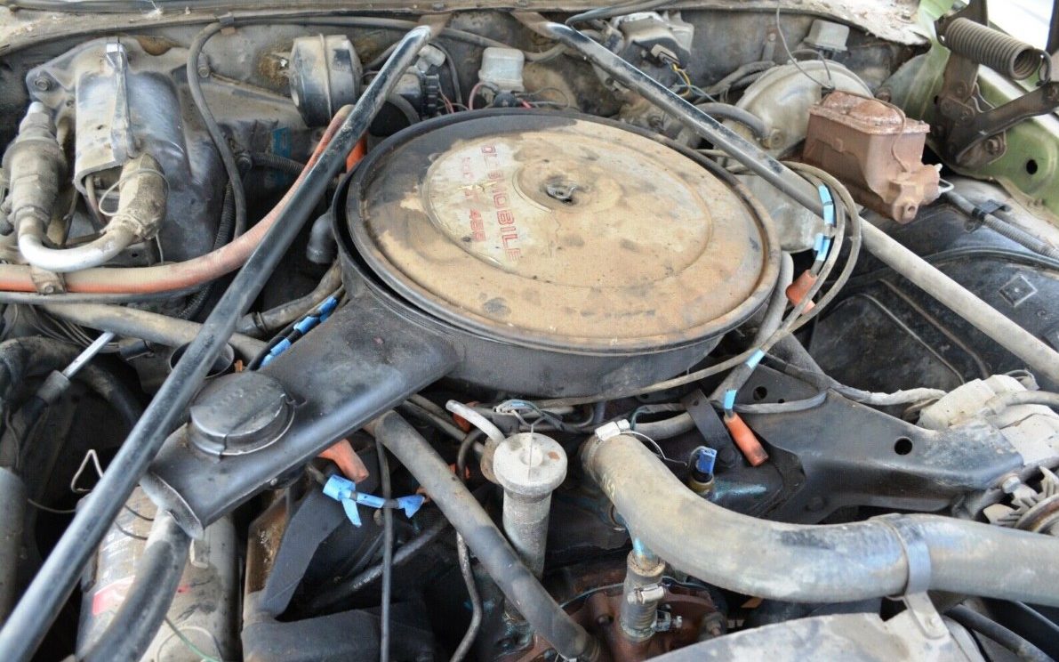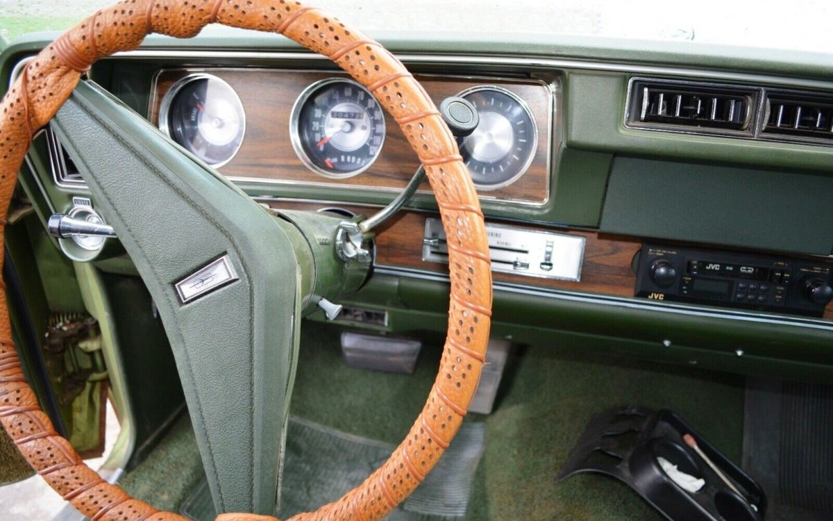 The L75 455 Rocket V8 made 270 HP and a bountiful 370 lb-ft of torque, not as potent as earlier high-compression models, but strong enough to tow your boat or travel trailer. The three-speed TH400 automatic transmission (used in some Ferrari models) should handle the strain of towing or ferocious burnouts with aplomb. Air conditioning and power brakes add comfort and ease. This green machine could cruise the vistas for hours, or at least until your gas card explodes.