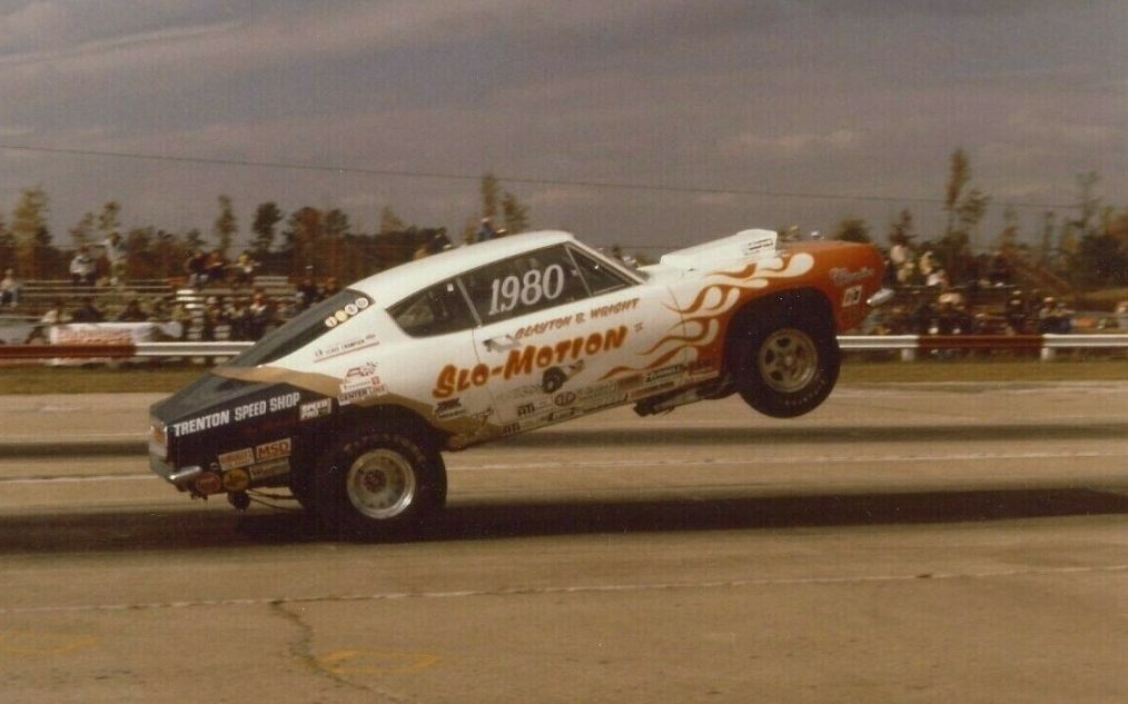 Here you can see the car during a race producing a monster wheelie! The Hemi under the hood was stout enough to lift the tires of the 3000 lb. car. Some of the racing accolades belonging to this car include the following: 1974 National Record at 10:17, 1978 winner – Pa. Dutch Classic in Super Stock, 1983 winner – SS/AA Class Championship at Indy, 1983 winner – Division 1 Super Stock Championship, 1987 winner – NHRA Summer Nationals at Englishtown NJ, and 1987 winner – IHRA Summer Nationals at Atco NJ.