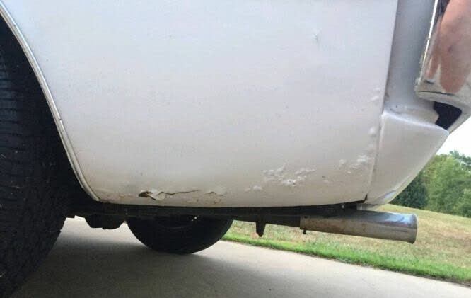 The car looks good from afar, but what appears to be an aftermarket paint job is showing a few missing chips. The driver’s side rear quarter has some bubbles brewing, indicating rust has started its thing, and we’re told there is some rust at or under the half-vinyl top, although we don’t see it in the photos. Chances are the next owner will want to strip it all down anyway and apply a new top and paint. The interior generally looks okay although there are a bunch of scratches on the console (from a big dog trying to get out of the back seat?) and the tray behind the rear shelf looks disheveled.
