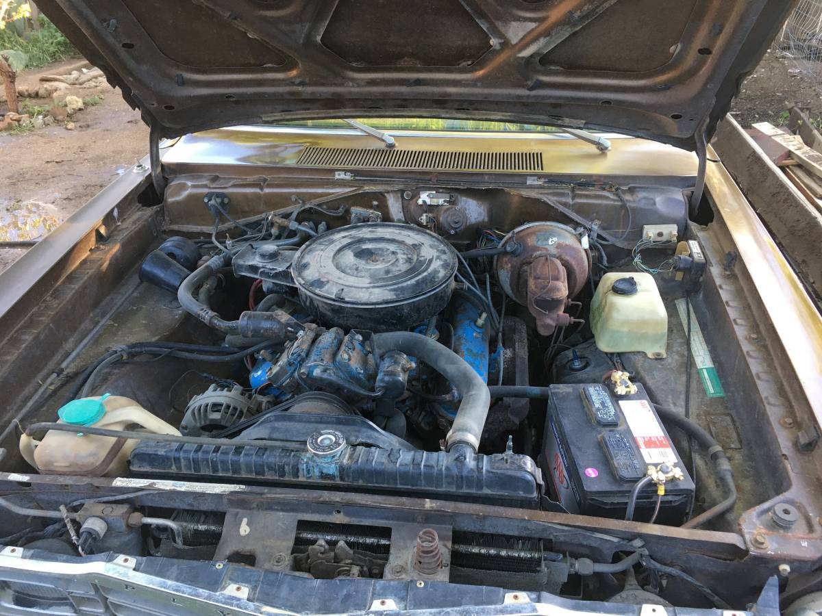 The bodyside stripes on this ride are correct for the Gold Duster Package option. The owner added the body side molding but is not correct for the vehicle specification. The wheels are not a factory issue or option. The air cleaner assembly is installed wrong. The air intake should be pointing at the battery, not 180 degrees opposite. A banged-up driver’s door detracts from the vehicle. 318 V8 is no slouch if you have not driven one in these “A” bodies.