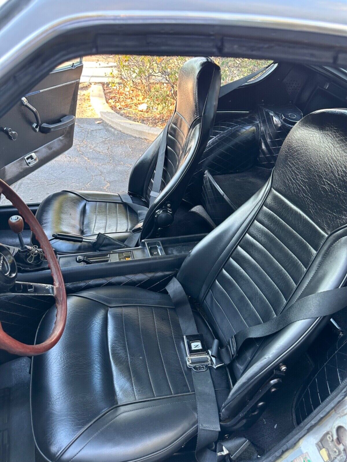 For an original interior, the Z car is in excellent shape. The bucket seats are quite tidy and of course, the big news is it has the preferred manual gearbox. A surprising amount of these came with automatic transmissions, so it’s not a given you’ll find three pedals inside. The bus-like wood rim steering wheel is another Z-car hallmark, so we love to see original details like those still in place. The same goes for the gear shift knob. The dashboard, like most of them, has some cracks showing.