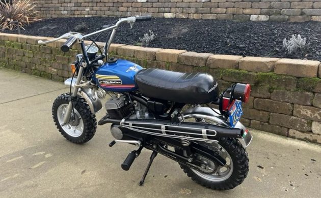 The clean-looking engine is an Aermacchi 90-cc two-stroke single with 8 horsepower and 6 lb-ft of torque. Power goes through a four-speed manual to the rear wheel and the seller says it’s been well-maintained and is ready to hit the road. There are a few scratches on the gas tank and probably elsewhere, but it would be a fun addition. Have any of you heard of this model?