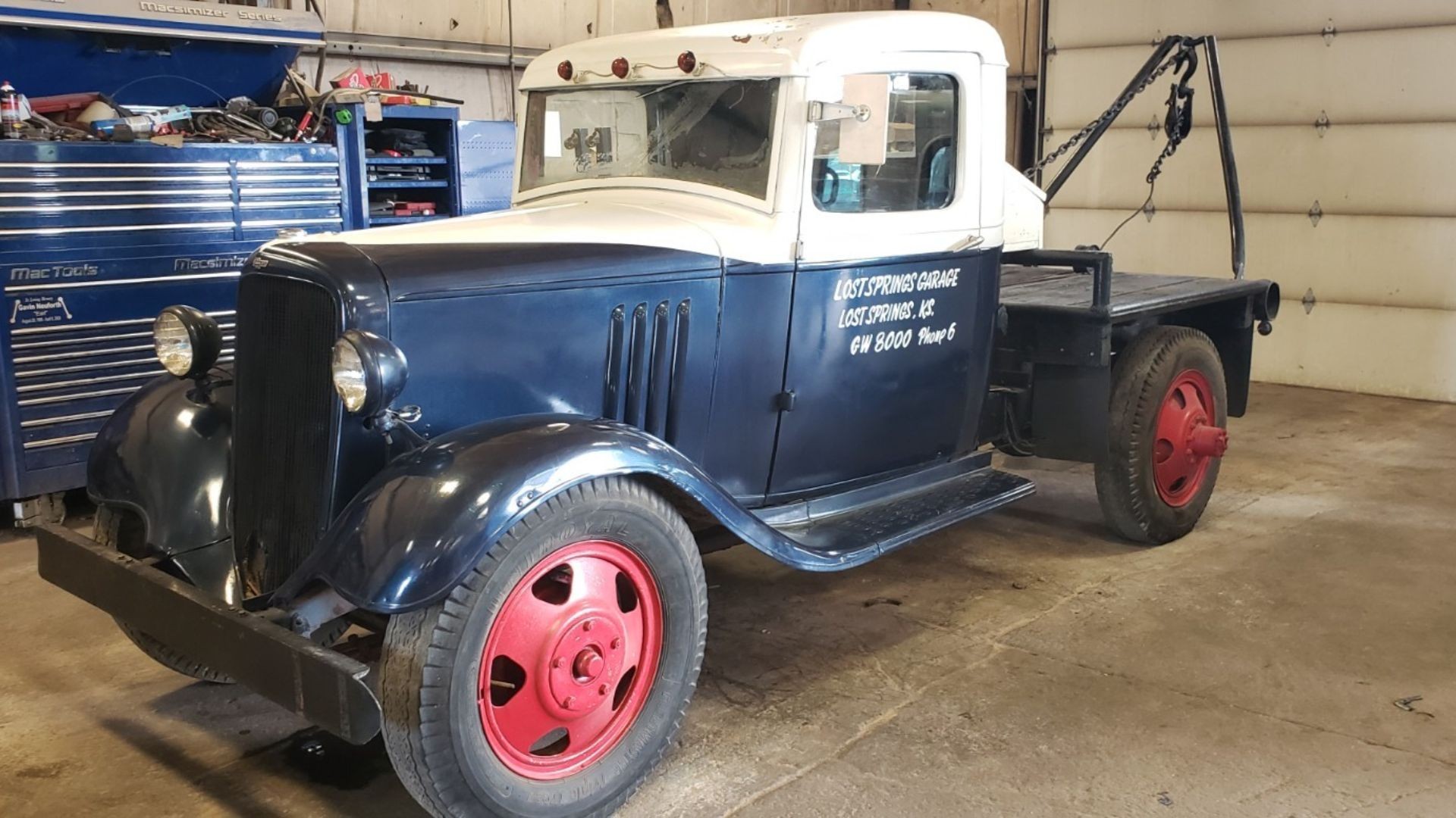 Painted in navy blue with a white cab roof and red steel wheels, the truck retains a look close to its working days. The hand-lettered “Lost Springs Garage” on the doors adds authenticity and charm, even if the paintwork is described as a “garage job” rather than a high-dollar respray.