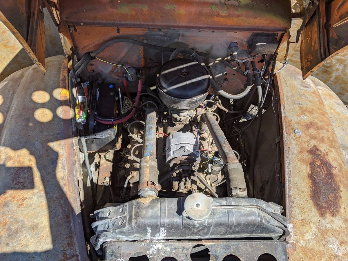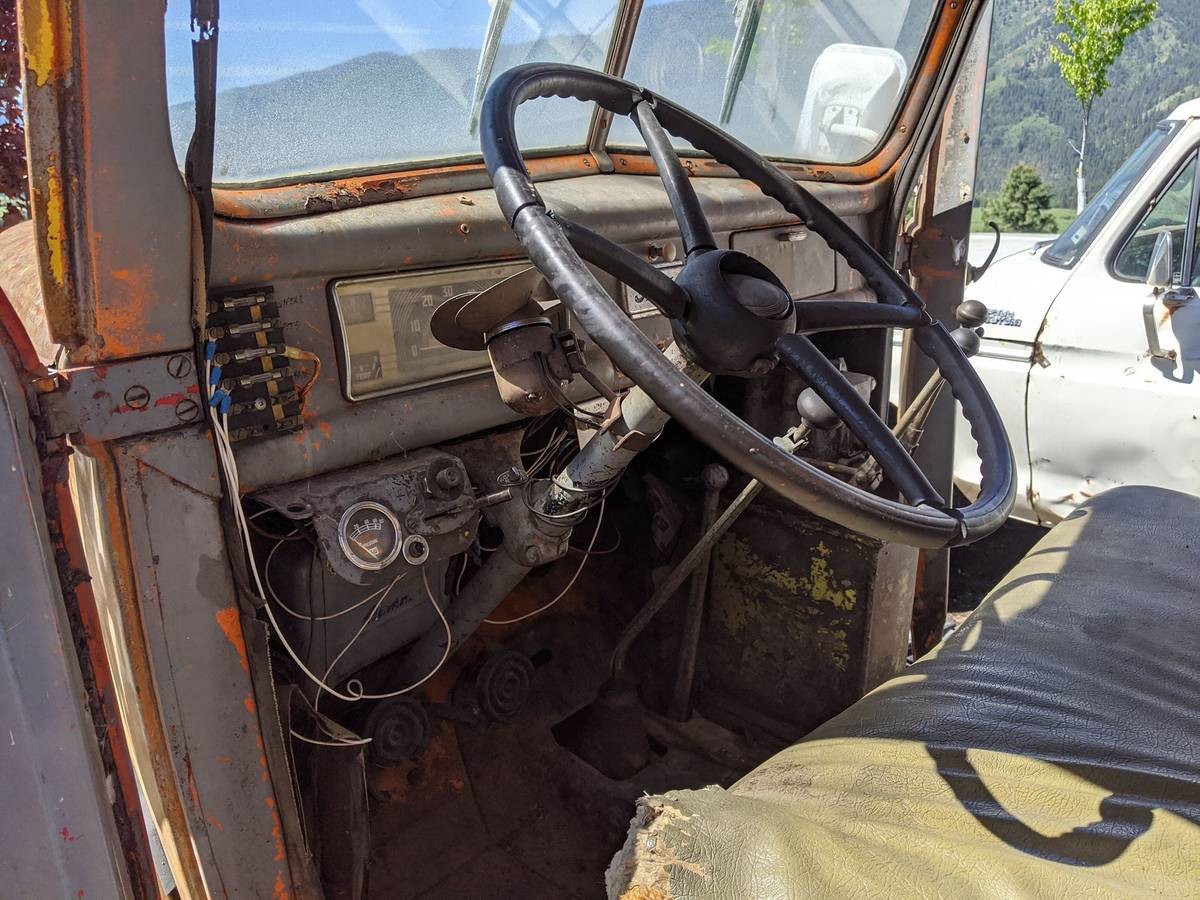 With that back story, we turn now to the truck at hand. We’re told that it was used on an airport for a number of years, and that both the truck’s Ford engine and International engine on the back run. We can see a lack of paint on the truck; the seller attributes this to a restoration begun, but on pause for some reason. We really just have to look at the pictures to get a sense of where this thing is at condition-wise.