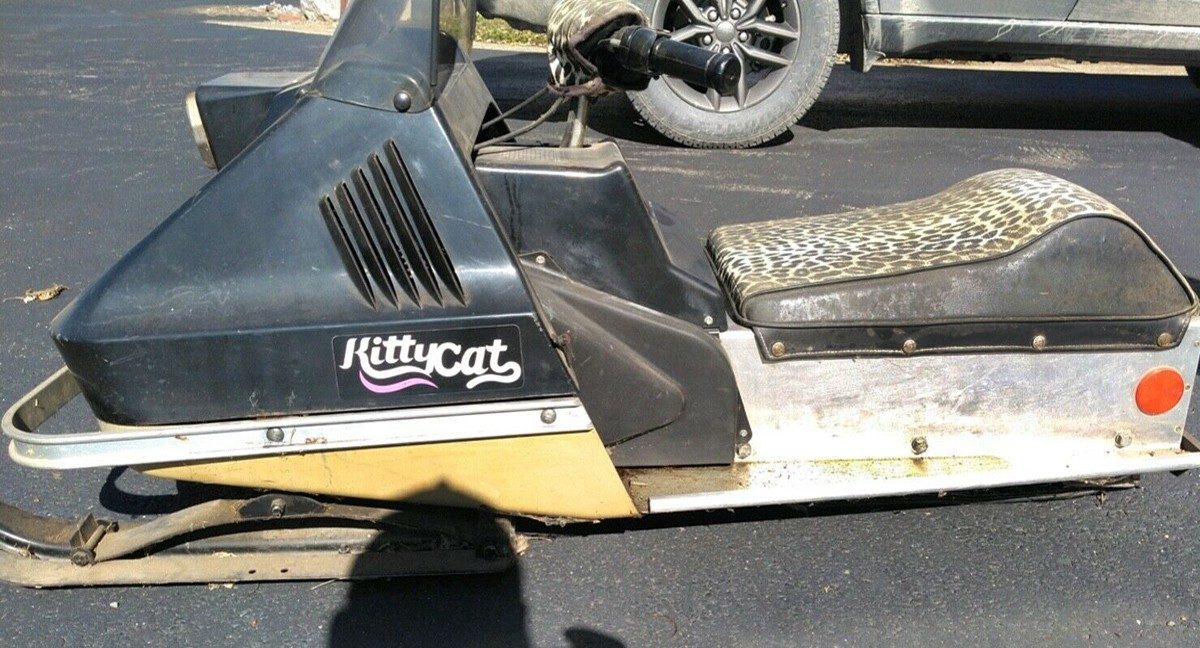 Sure do remember these, coming from the land of the snowmobile( Minnesota claims to be the snowmobile capital, but it was Wisconsin that invented it) Back from a time when snowmobiling was a family sport. Not like today, with sleds that have more hp than my S-10 pickup had ( 4 cylinder) and race at breakneck speeds, tearing up the trails to the next watering hole with front skis that never touch the ground. Children were encouraged at an early age to get into this, and the Kitty Cat was the coolest thing a kid could have for winter. The kids no longer had to ride on the back of mom or dads sled, LAME, and these were just the ticket. They sold a bunch, but like most childrens toys, the kids got older, and got bigger sleds ( or moms hand me down) and these got shoved in a corner under a pile of crap. I think these had a throttle limiter, and could be “turned up” by enterprising children, and it began. Snowmobiling, like motorcycles, is something, once you do it, it sticks forever. When I began snowmobiling, sleds were a dime a dozen. I had an old Scorpion ( terrible sled) I think I got for $100 bucks. Today, I know a guy, his daughter bought a new SkiDoo, all the doodads, GPS, reverse, 10 power ports, probably go 100 mph for,,,are you sitting down? Almost $12,000 BUCKS!! IDK, same old thing, either make them affordable and sell a million, or make them so advanced, nobody wants or can justify sinking $12g’s into something you may not even use, and only sell 4. Winters are funny, and fickle, and I wouldn’t put more than a grand into a sled today. Great find, however, with as twisted as our society is today, some kid with this would be the laughing stock of the neighborhood. It never used to be that way.