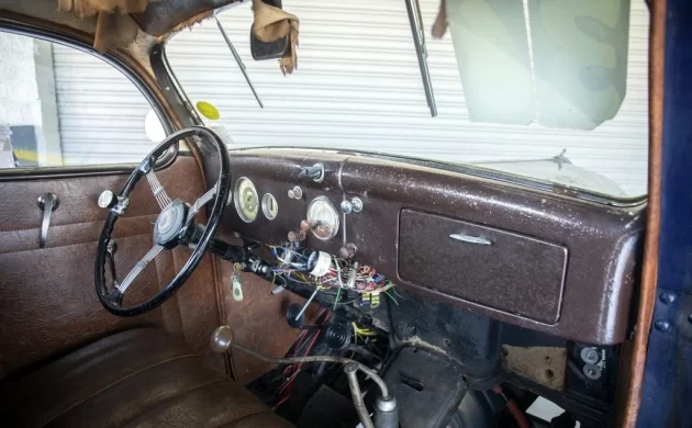 Based on the trim, I believe this Ford is the rarer DeLuxe Coupe (29,938 produced vs. 78,534 Standard Coupes), as it has bright trim on the headlights and windshield, in addition to having two taillights (no, that was not the case on the Standard), trim rings on the wheels, and a rear-view mirror. Aside from the headliner, which is shown in several pictures and was clearly mouse-infested for much of its life, the interior looks perfectly serviceable. However, look at that wiring under the dashboard. There’s more in the trunk (this car doesn’t have a rumble seat). In my opinion, most of this needs to be torn out and the new owner either needs to see what is left of the factory harness or start anew.