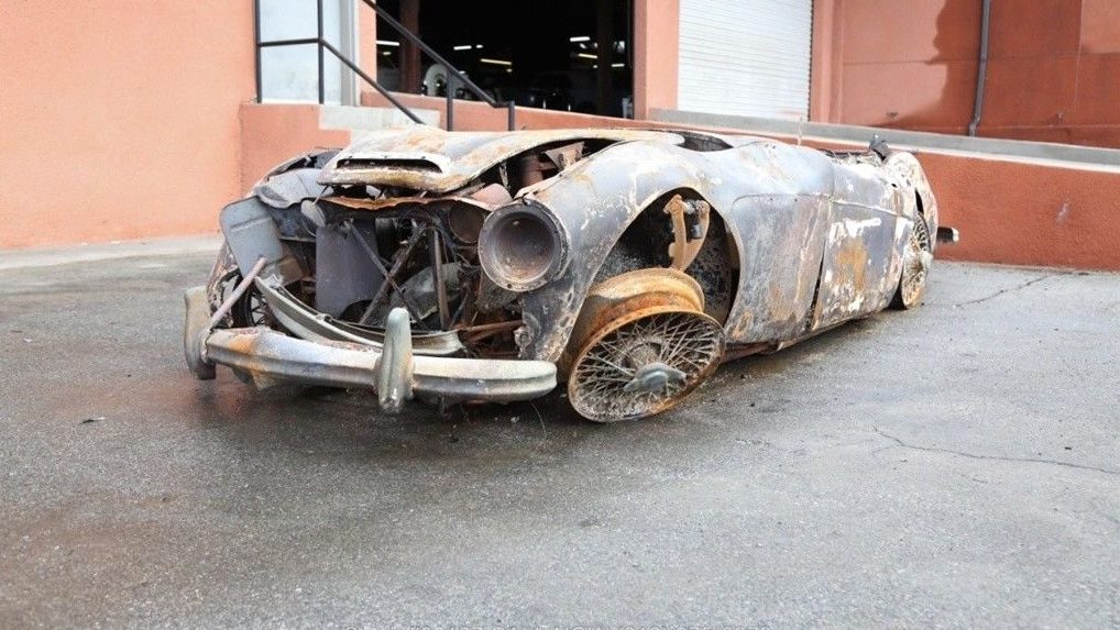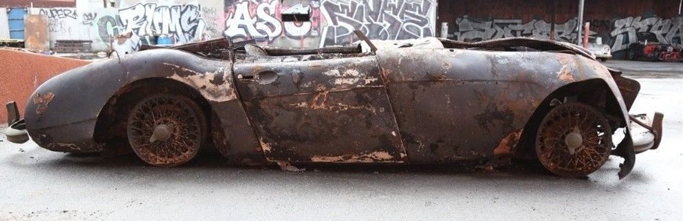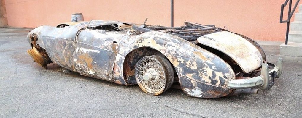 A front end impact is also obvious, with crumpled fenders and a nose that bows out around the engine bay. Speaking of, the seller notes the manual transmission and dual carbs are included with the sale. While there’s likely a component here and there that can help a Healey restorer, is there an outside chance this entire carcass will see the light of day as a finished car?