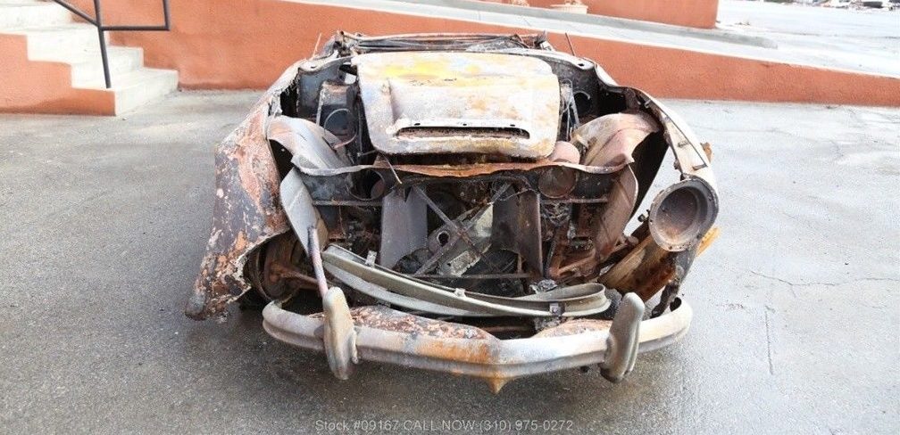 The amount of damage is somewhat staggering, from an apparent roll over (note the missing windshield frame) to a fire or long-term desert storage that consumed the whole car (all four tires melted off and obvious scorching of the paint). Whether the intent to be humorous is not possible to discern, but we had to laugh when the seller noted that the soft top frame was included.