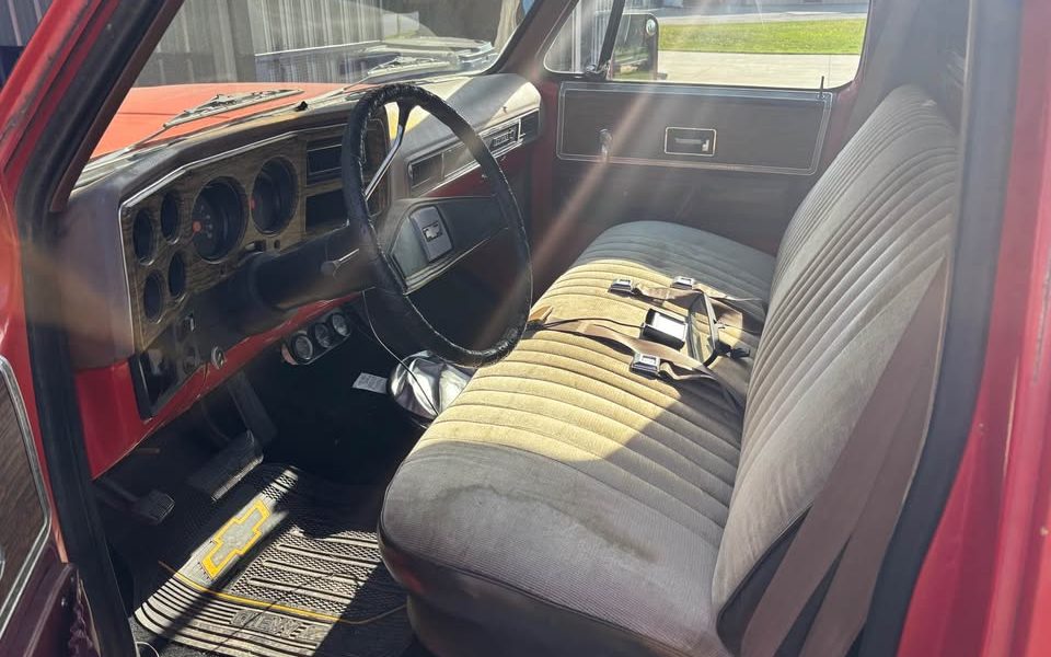 The fender badges are missing as well, so I had to zoom-in on the dashboard to determine that the Squarebody has the one-step-up-from-Custom-Deluxe “Scottsdale” trim, which included some faux woodgraining, a little more bright work, and fancier exterior trim. I’m not sure that the seat/upholstery is factory equipment, but Chevy made this bodystyle for so long that there’s bound to be some mixing and matching over time.