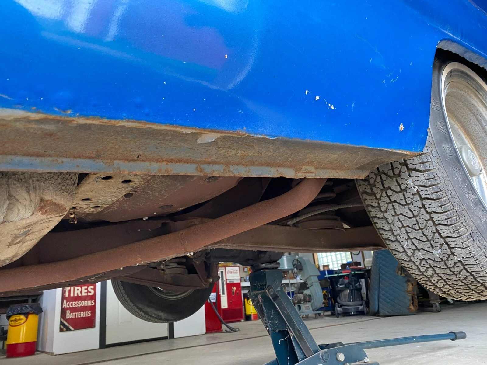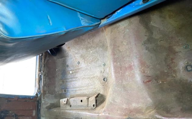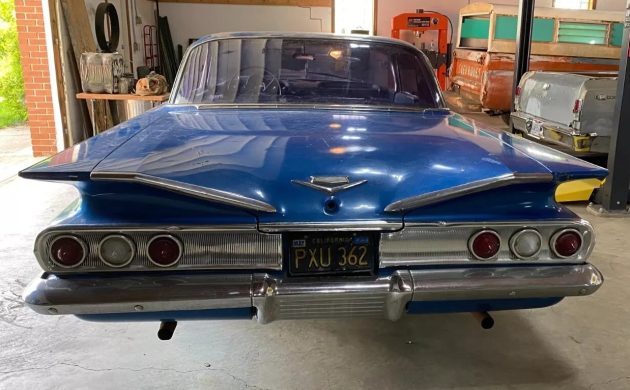 From its curvy windshield to the space-age quarter panels, the ’60 Impala has one of those bodies that looks good from any angle, and the exterior here seems straight for the most part. A dent in the driver’s side fender is pointed out, which is probably repairable, and hopefully, the rest of the panels won’t require too much effort before this one’s ready for a respray in whatever the new owner desires. Some photos show a bit of rust bubbling through the blue paint in the lower extremities, such as underneath the doors and the bottom quarter area, so a few repairs will be needed here and possibly elsewhere. However, the platform seems to be in fine condition overall.