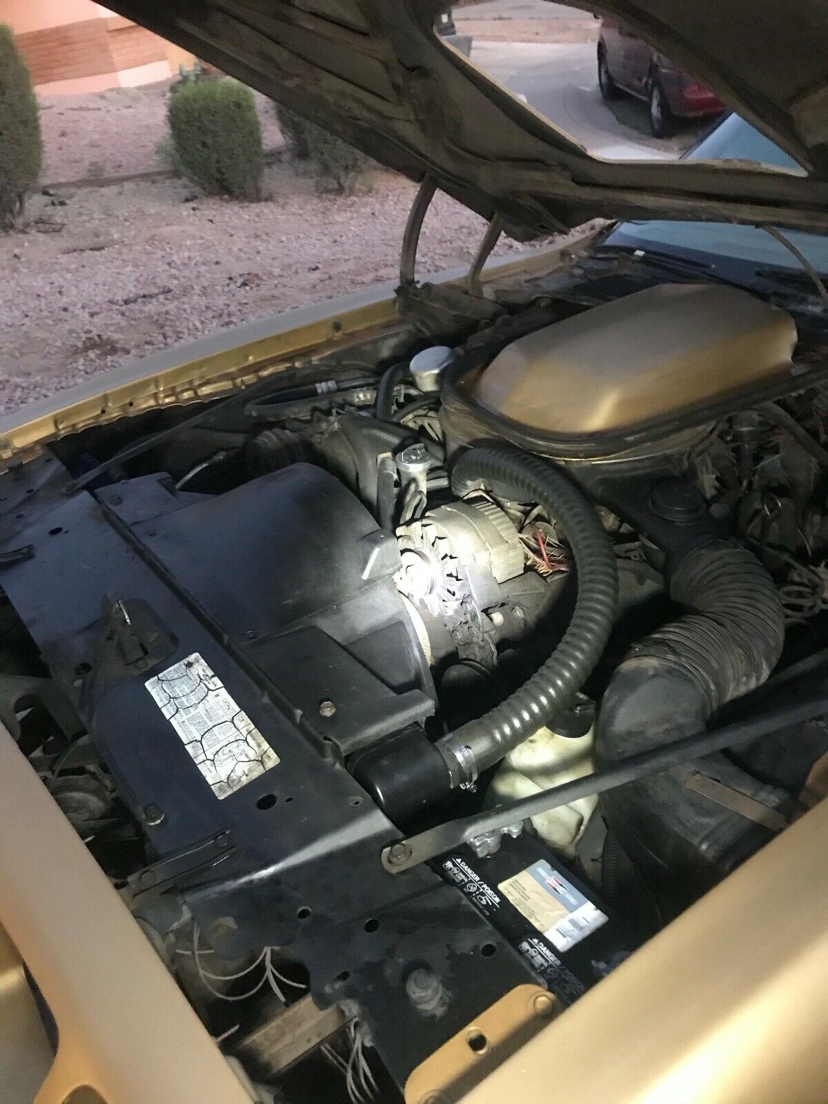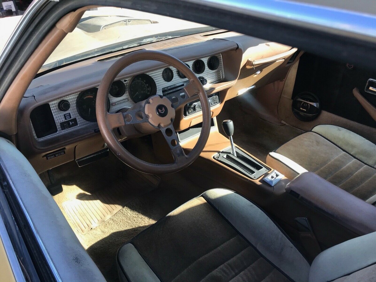 The tan velour interior of this car is sun-baked. The seats looked to have been recovered at some point and the dash is badly cracked. The car is well optioned with power windows, tilt steering, air conditioning and cruise control. The door panels don’t look correct but that might just be the lighting. The seller claims that the car has the famous WS6 handling package. In 1979, Car and Driver named the Trans Am as the best handling car in the US for Trans Ams equipped with this suspension. However, WS6 cars came with 8 inch snowflake wheels and this car has 7 inch snowflake wheels.