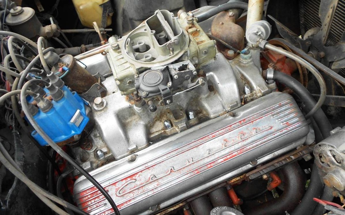 Reading the tea leaves of the spartan listing, this could be a 1965 solid-lifter 327 cid (5.4L) V8, possibly the potent L76 mill making 365 HP with a Holley carburetor. Chevy experts are welcome to comment below! Only the distributor cap suggests this engine has received any recent attention, and the seller indicates that the carburetor and brake master cylinder are toast.