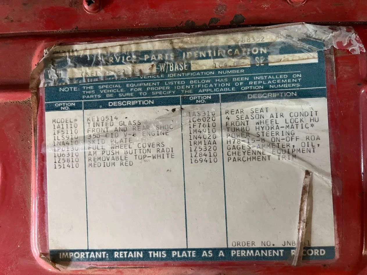 The nice thing about Chevy trucks of this vintage is that the optional equipment is listed on a “plate” in the glove box. This Blazer was clearly ordered by someone with money to spend, because it is a suitable forerunner of the optioned-out modern SUV. It has the biggest engine available, the 175-horsepower 350 small block, which is also equipped with air conditioning, not bad for a truck in 1972. The seller says that the air “blows cold but needs attention,” as the high speed setting on the fan doesn’t work (and the switch has been changed). It has been serviced with new R12, hoses, filter/drier, POA valve, and expansion valve – refreshing. The transmission is Turbo Hydra-matic, which is a Turbo 350 based on the undercarriage pictures. The seller says that the engine runs well except for a little smoke on startup at times, and since it doesn’t use an appreciable amount of oil, it could need something as simple as new valve seals.