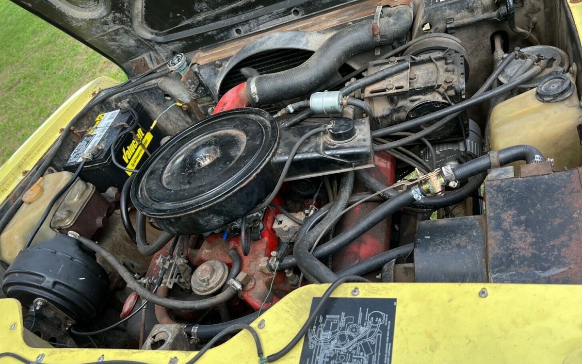 The seat upholstery is said to be original, and to have traveled in the hot sun all those years it still presents respectably, although there is at least one tear on the driver’s side seat in the lower-left area near the seat belt. The dash has some cracks, but the carpet is new. No specific word on the gauges, but the dash lights are said to be working, as are the blinkers, horn, and wipers. Air conditioning is present, but the seller says it needs a charge. The heater is said to be functioning great.