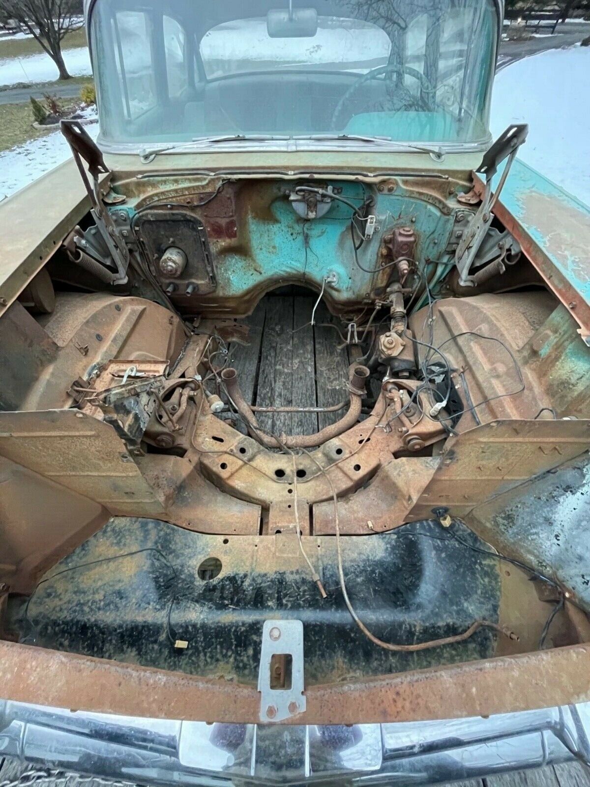 I drove a ’56 from new to 1968 when it died from the tin worm. They actually drove very well for the time, the 6 was even happy all day at 70 mph, but the 4 door sedan, although very fine for 6 adult passengers, was, to my mind, the worst looking of all there were – in order of ” attractiveness”: Nomad, convertible, 4 door “hardtop”, 2 door hardtop, regular station wagon, 2 door post sedan, and lastly the regular 4 door sedan which as cars go, from the side, was, to me, butt ugly. “You couldn’t give them away” in 1968, but I sold mine for $50 to a guy who took out the 6 and put in a big V8 and raced it as a local “amateur” stock car. The frame was solid, he welded the doors and gutted the interior, took out all the glass except the windshield. A mutual friend told me he had dropped it into a local big river, and I feared someone finding it and the authorities coming after me, since he never registered it.