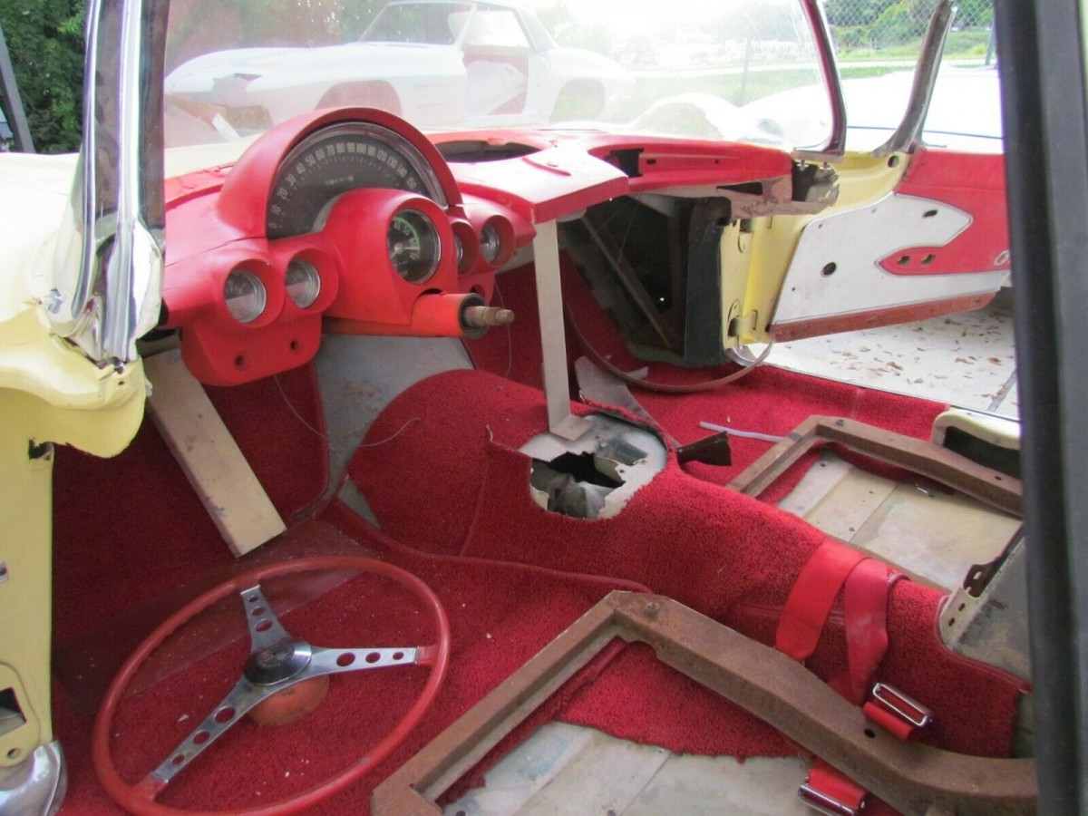 It’s obvious from the pictures that the whole car has been disassembled, and that the dash, hood, trunk lid, exterior trim, etc are just sitting on the car, and lots of other parts are missing. The body looks pretty rough, and whoever shot the yellow primer on it, didn’t do the buyer any favors, since it will need to be stripped to get an idea just how bad the body is. I can’t say I’ve ever seen an early Corvette with a busted up dash, but if the buyer is a reader here, I do have a good used 60 dash top I’d sell. LOL
