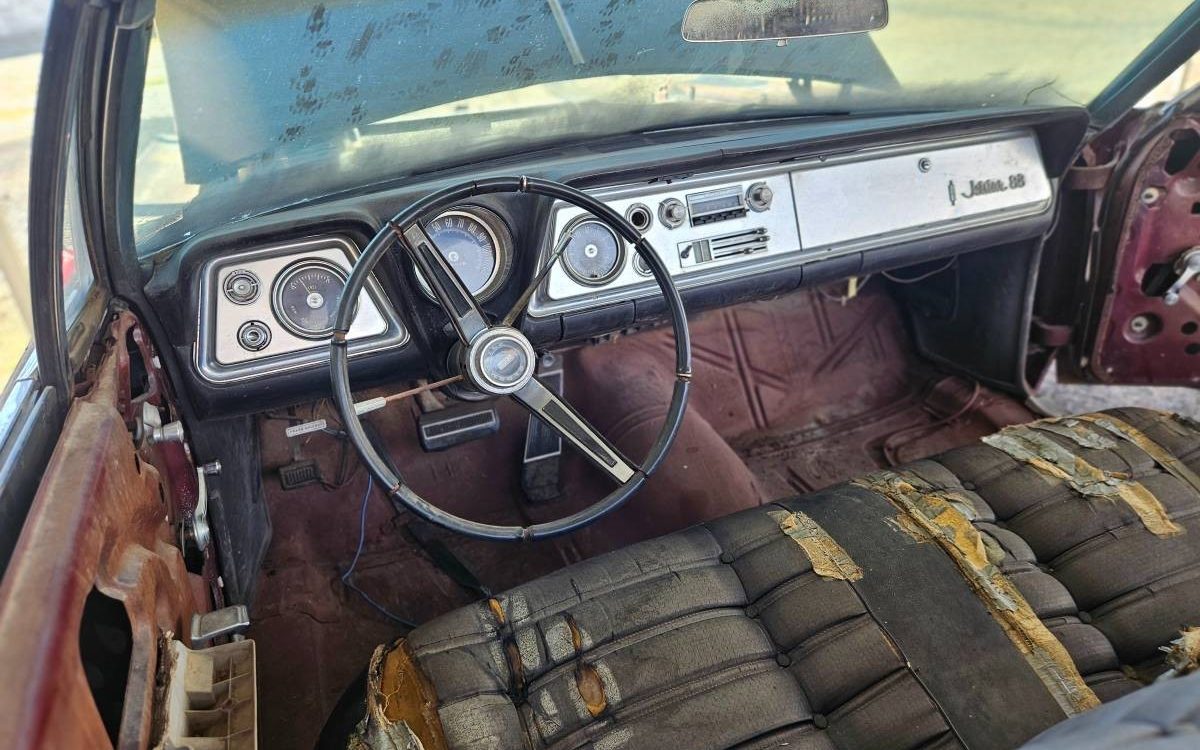 Under the hood lies a mystery. The seller says that this is a big-block 425 that “runs good,” but all my materials say that the 330-cubic-inch small block (in several varieties up to 315 horsepower) was the only engine available in the Jetstar 88. Of course, the 425 is an easy swap in any car that had a 330, which also adds to the confusion; it is very difficult to tell the difference between a 330 and a 425, and any easy tells that I know of are not visible in this picture. Maybe our Oldsmobile-loving commenters can give us a hand here. As it stands, I’m willing to accept the seller at face value, and either engine is excellent.