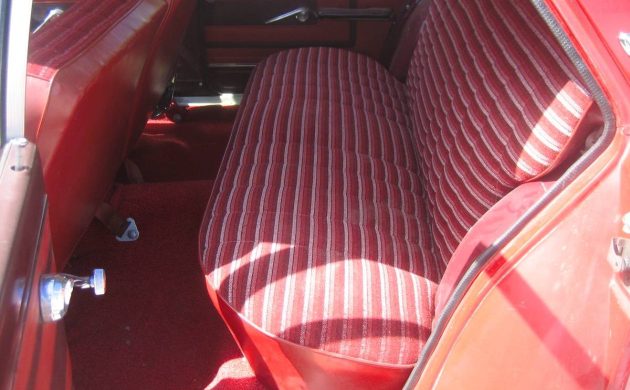 The smart-looking red interior on this Cross Country looks to be in very good condition. The striped fabric on the front and rear seats aren’t showing major wear and tear, and the door panels look great as does the red carpet, steering wheel, and instrument panel. It’s equipped with power steering and an automatic transmission.
