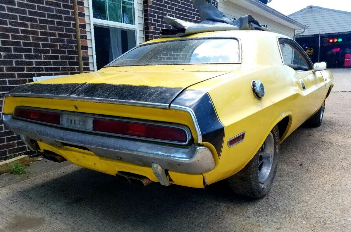 The interior is said to be complete except for carpeting (removed) and that the Rallye dash has been swapped for one with a standard instrument cluster. But what’s there is showing its 83,000 miles and will need a refresh. One of the photos reveals all the seats removed, presumably to show the overall condition of the floorboards (but not the spot where the rust is said to be). We’re told the 383 V8 functions, but work will have to be done on the transmission to get it to pull (diagnosis unknown). This Challenger is equipped with a Sure-Grip 3.45 rear axle.