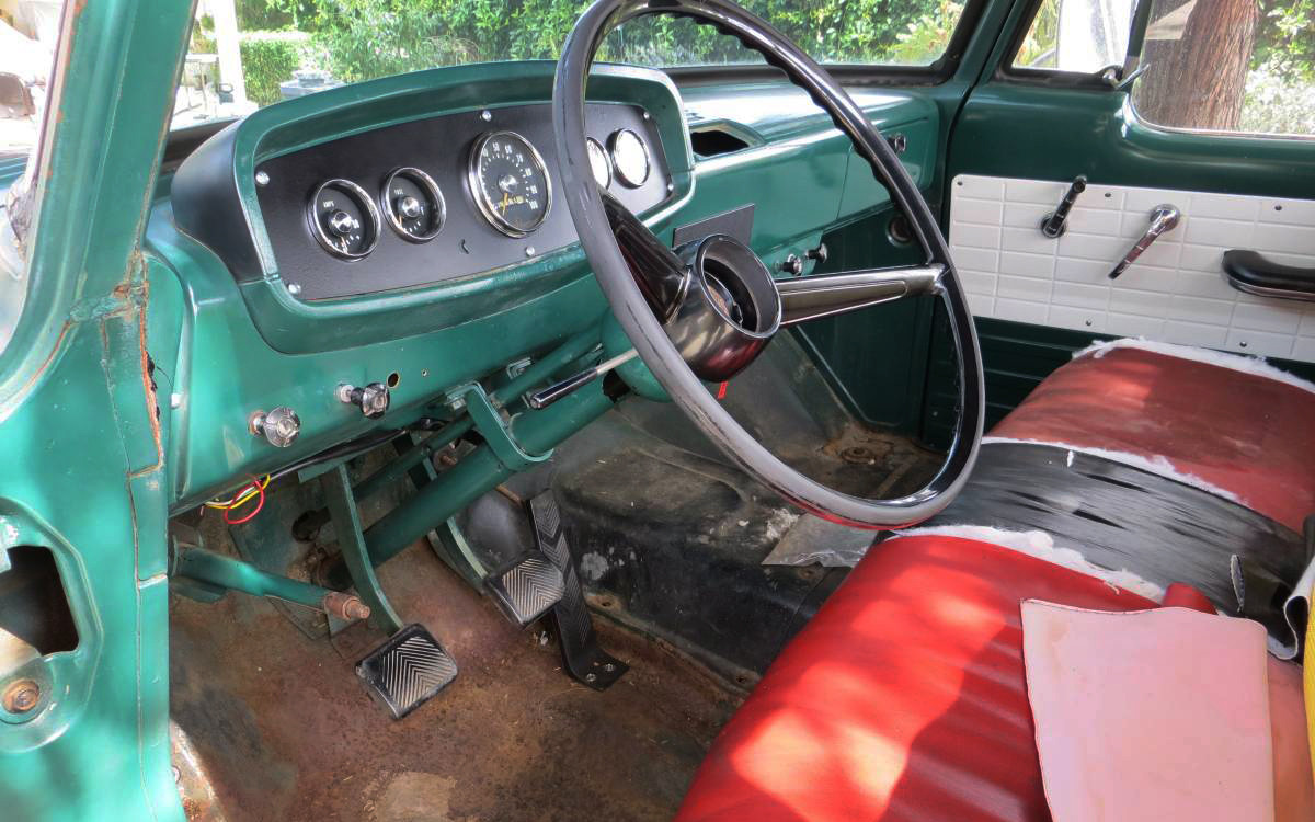 I have a 4 headlight Sweptline, a ’64, and prowled California pick a part yards in the ’90’s looking for parts. They were kind of common then. The dash instruments are original for a 61 or 62, they got a plainer setup after that. The entire interior of these trucks were painted body color, excepting bolt on parts. This one has the steering column and parking brake lever painted green, they were originally black.