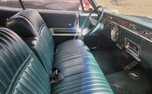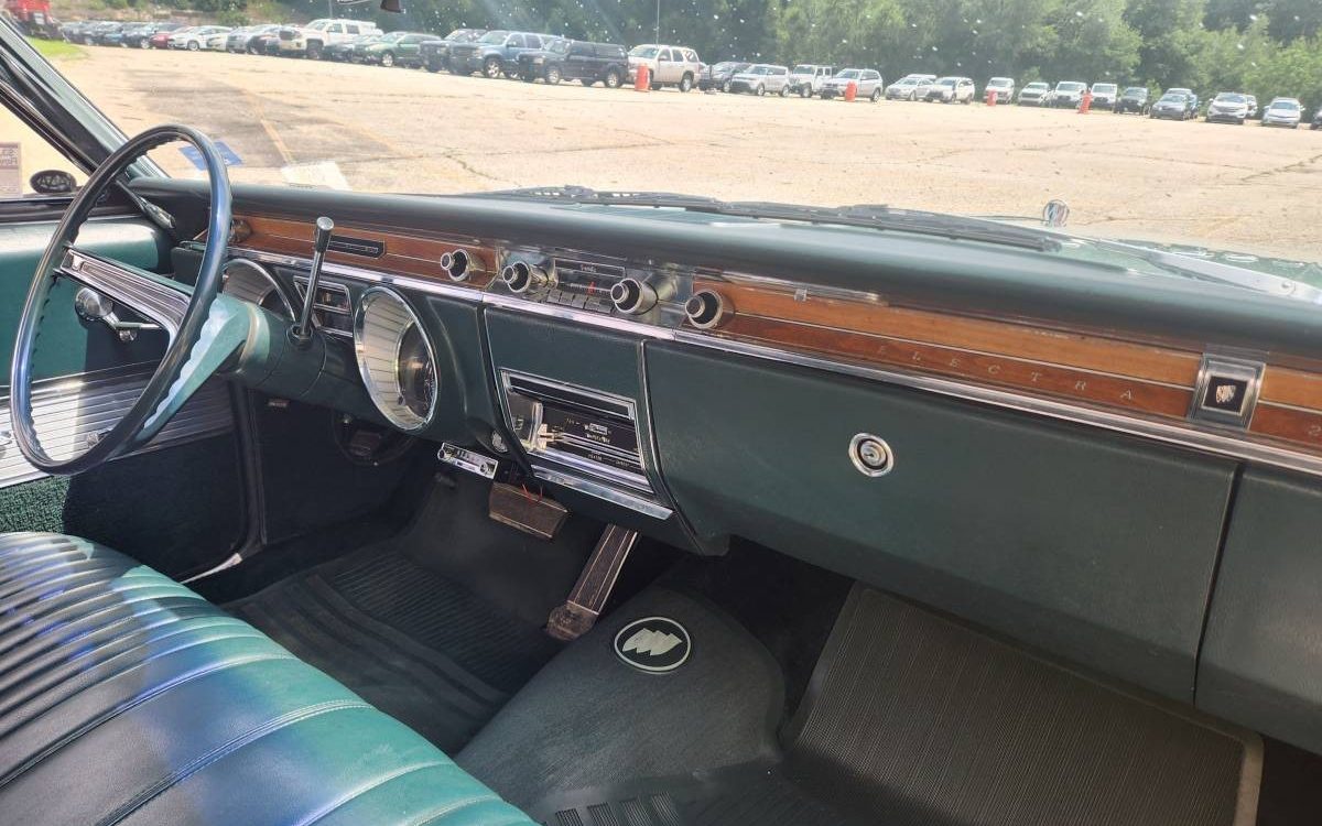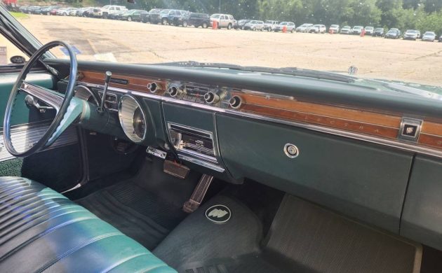 Here’s the plush vinyl interior with a split bench seat and folding armrests for both front seat passengers. The green trim harmonizes well with the Seafoam Green exterior, and the “wood” accents on the dashboard give the Electra a properly Buick feel of conservative luxury. I give this Sport Coupe bonus points for the Tri-Shield front floor mat, which is almost a requirement when you own a big Buick from the ’60s.