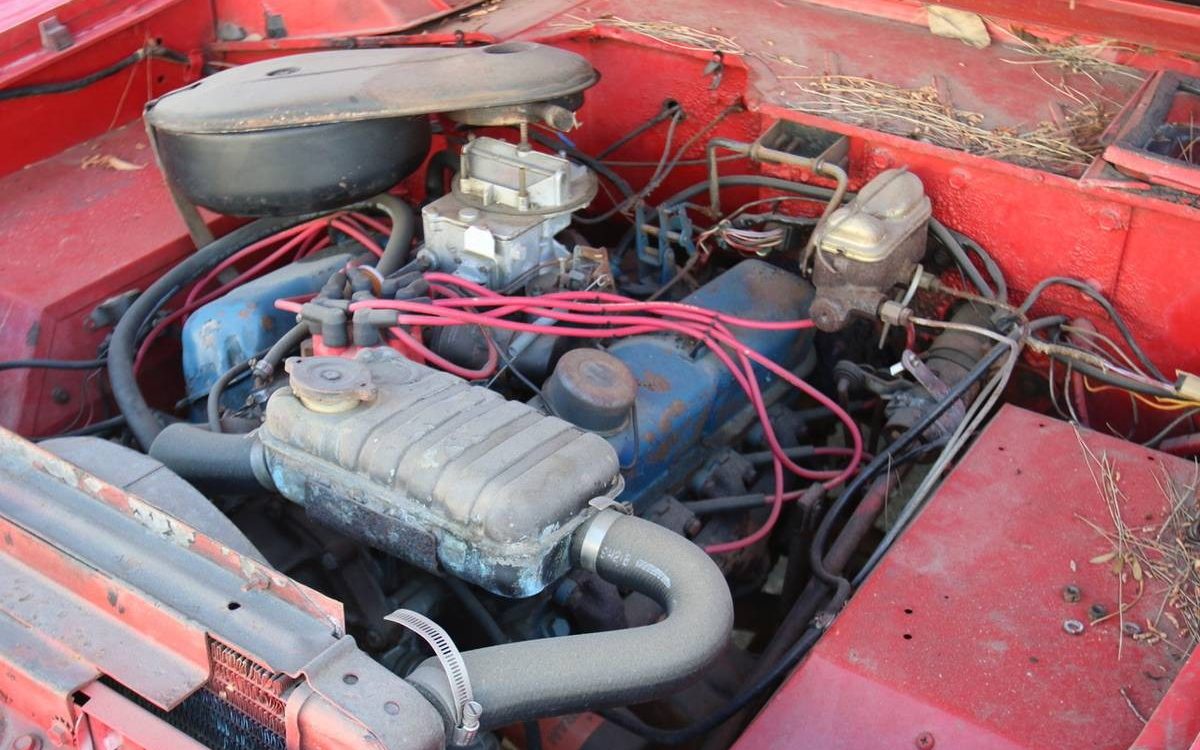 If the current engine is the original power plant, it is a 289 cubic inch V8. The ad says that it runs, but the details of the mechanical condition is not known. You can tell the plug wires have been replaced at some point. If it has been sitting for 10+ years, it is a huge plus that it still runs.