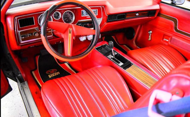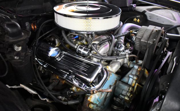 A sea of brilliant red vinyl makes a bold and sporty statement inside, along with the angled center console. Aftermarket gauges (Oil Pressure, Volts, and Water Temperature) supplement the left binnacle’s trio of idiot lights (Amps, Water, and Oil). A three-speed automatic transmission handles the gear-changes. The seats look better-than-new, though it would be nice to see the steering wheel, and the seat belt loop shows deterioration and fading typical of General Motors products of this era. Overall, it’s looking great in here. Power windows would be nice, but many buyers saw them as “another thing that can go wrong,” choosing good old reliable cranks and a savings of maybe $48.00. Someone’s gone over what was probably simulated wood grain with some red paint for a dash of high school creativity.