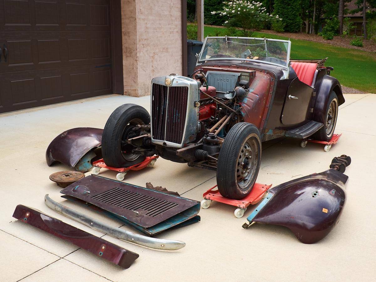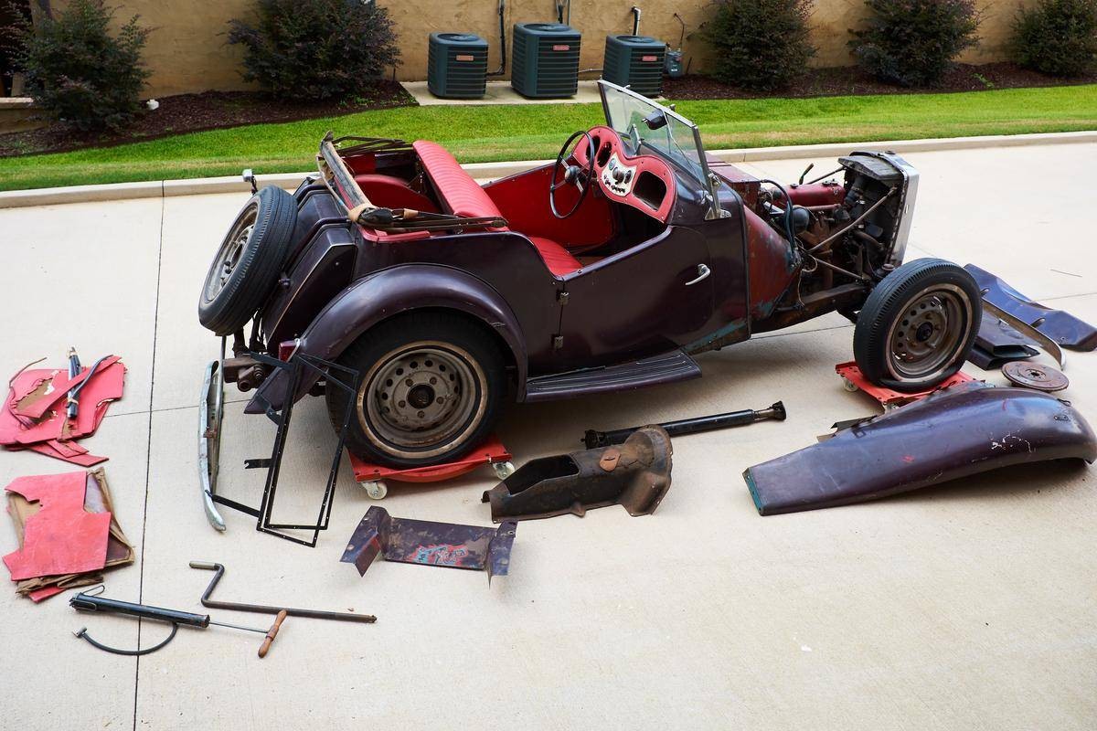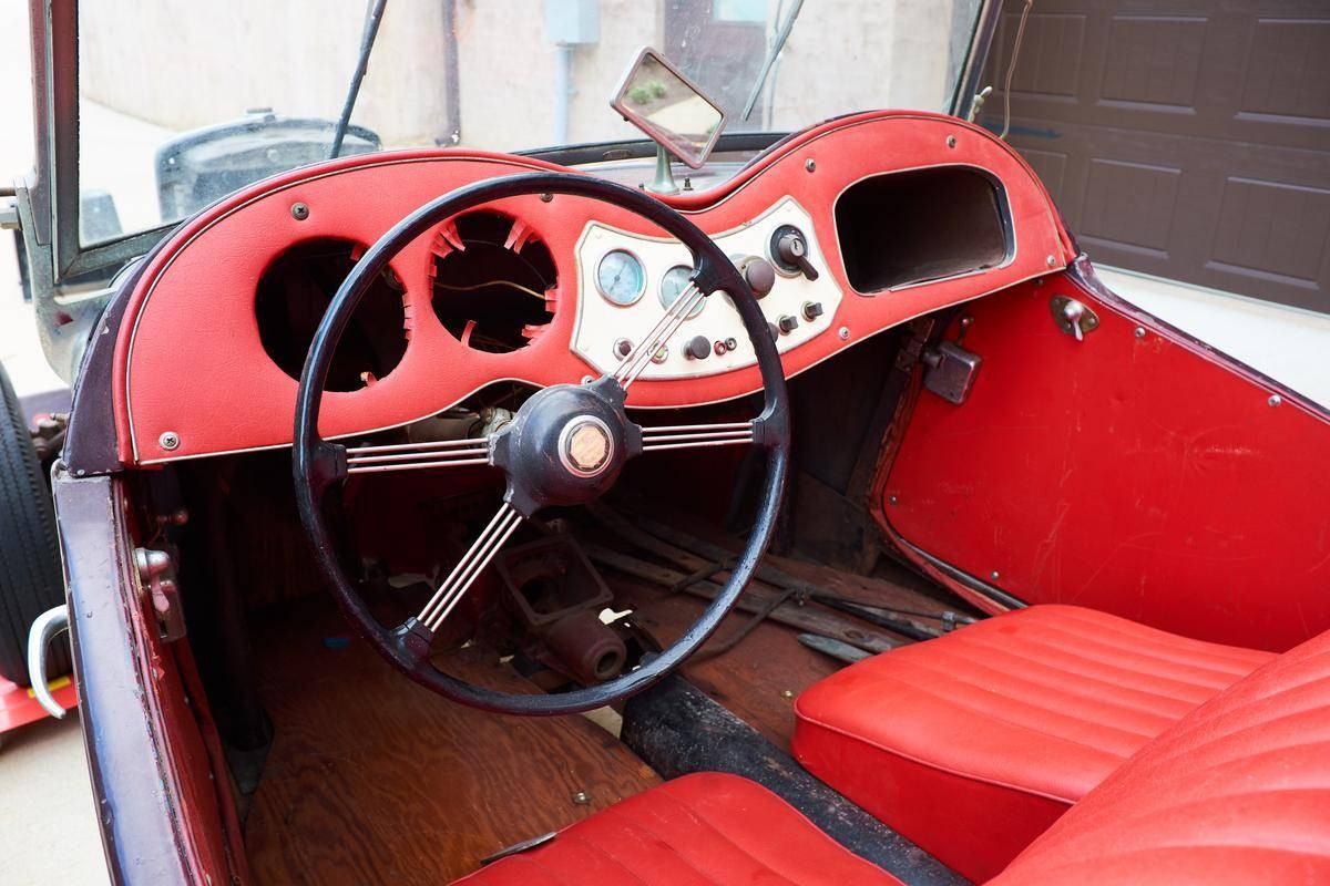 The seller is the third owner of the car and he acquired it in a partially-disassembled state 21 years ago with the intention of completing the restoration. How much he was able to get done is unknown but the body of the car appears to be mostly together with only the front fenders and bonnet off in the photos. We do not have any photos or description of the ash body frame, so it would be on the checklist for inspection. The paintwork is a mixture of colors with a dark maroon on the exterior, MG Red on the firewall and what looks like Clipper Blue on some of the panels. There is no mention of a top and side curtains.