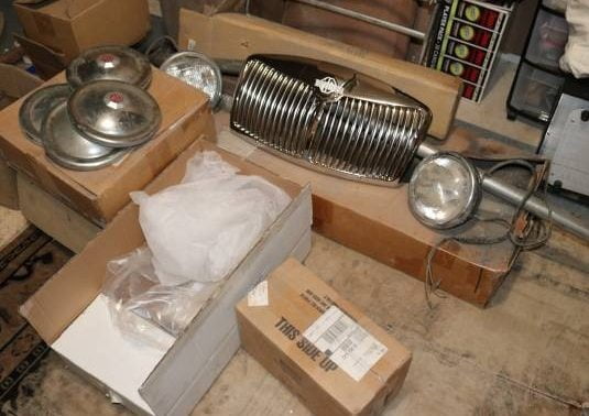 The MGA evolved from a 1951 Syd Enever design of a Le Mans car built for George Philips. The beautifully articulated fenders and running boards were eliminated, Enever bringing the wheels inside the body envelope. From 1959 through 1961, 31,501 of the MGAs were produced with a variety of component configurations. Our subject car was equipped with a 1588 cc in-line four-cylinder engine producing 79 horsepower, left-hand drive, four-speed transmission, front disc, rear drum brakes, and stamped steel wheels with hubcaps (“I Spy” the box of hubcaps in the next photo). Reminder: MGAs have no exterior door handles for that clean, shaved look. The car originally sold new in the $2,450 range; J. D. Power now prices 1961 MGAs from a low retail of $17,100 to $50,300 high retail for a specimen in excellent running and appearance conditions. No price provided by J.D. Power for boxes-o-parts.