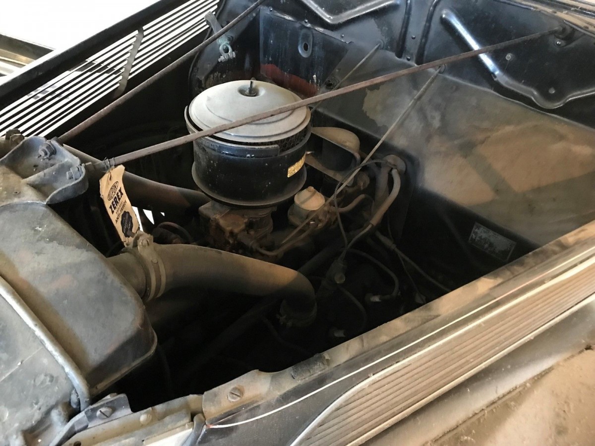 The interior in this car looks to be either a well cared for original or an older restoration. Being a car with standard trim, we see the black steering wheel instead of the chrome “banjo” wheel that collectors and customizers love. The wood grain on the dash is in very good shape, and the rubber floor mat looks very useable as well. It would be nice to see what the seats look like under the old Western Auto style seat covers. It would also be nice to know what is in the cigar box and on the floor. The circular objects wrapped in old newspaper might be the hubcaps.